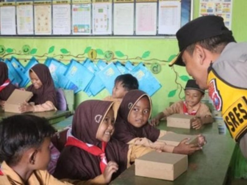 Kapolres Probolinggo Bagikan Makan Gizi Gratis di Sekolahan
